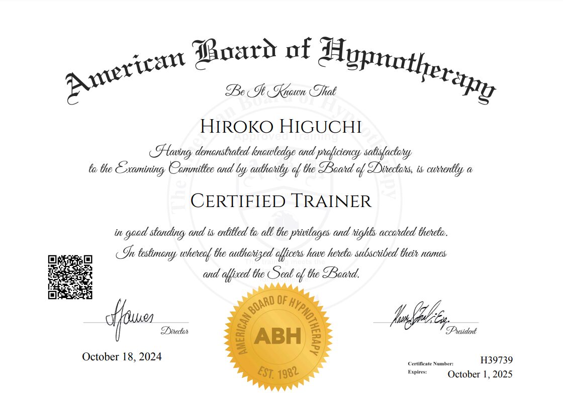 - 所定のカリキュラム修了後、米国催眠療法協会(ABH)認定資格を申請できます